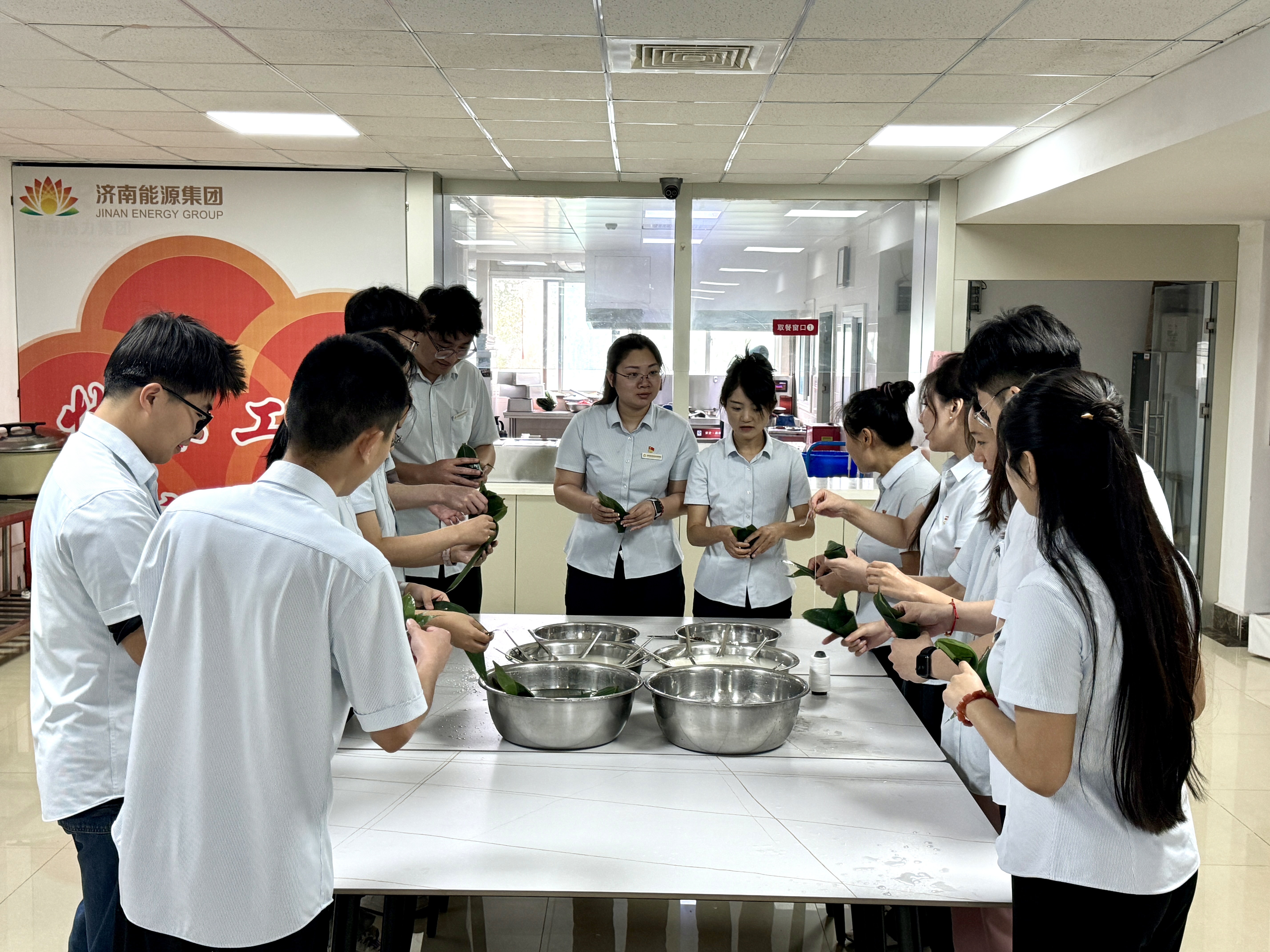 6月7日上午,在山东睿冠电能热力有限公司迎来一场端午包粽子活动,能投集团的团员青年、工会代表将提前泡好的糯米、粽叶、蜜枣等材料准备好,捋粽叶、抓糯米、添蜜枣、缠粽线,最后再给粽子打上结,围在一起热火朝天的忙碌着。大家包的有模有样,一套动作下来行云流水,一排排精致的粽子映入眼帘,现场气氛其乐融融。